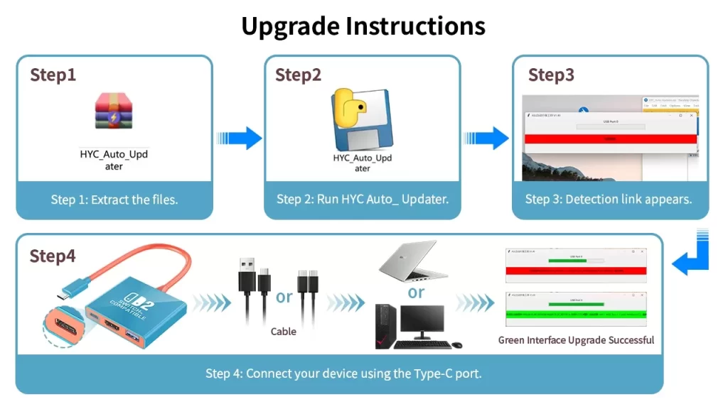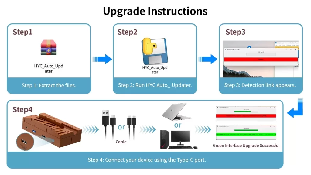 Friendly reminder: Please ensure the device remains securely connected until theupgrade is fully complete. Disconnecting it prematurely may result in a failed updatepermanent damage to the HUB’s chip!